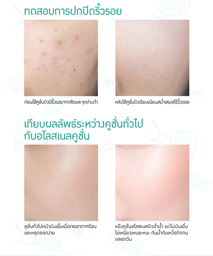 • Вещества, содержащиеся в кушоне, увлажняют кожу, не оставляя жирного блеска, защищают от ультрафиолета.